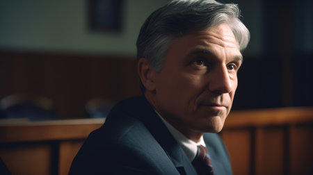 Lawyer Male Caucasian Middle-aged Presenting in court in Courtroom. Generative AI AIG22.