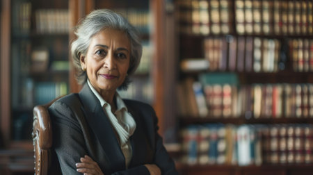 The picture of the senior indian female lawyer working inside room filled with the books or library, the lawyer require skill like law expert and knowledge, experience and negotiation skill. AIG43.