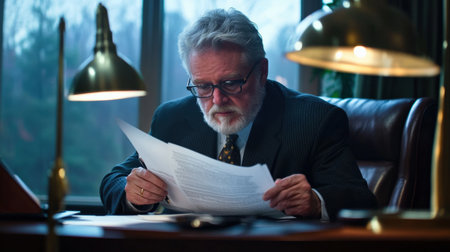 A focused executive evaluates paperwork in the prestigious setting of a wood-paneled office, reflecting professionalism and determination. AIG41