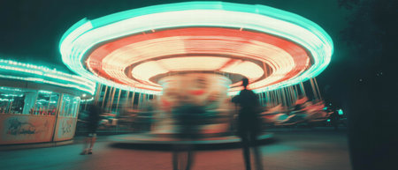 Colorful carousel spinning in motion at night creating a playful atmosphere