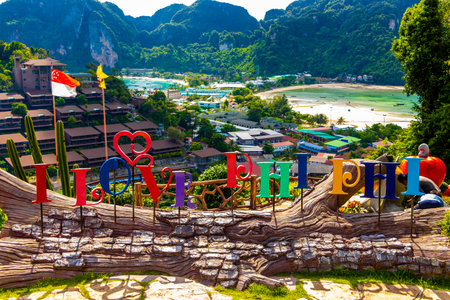 Ao Nang Krabi Thailand October 21, 2018 Panorama view and I love Koh Phi Phi sign lettering on hill on Koh Phi Phi Don island in Ao Nang Amphoe Mueang Krabi Thailand.