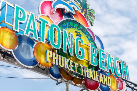 Thailand - April 2, 2019 : Illumination of Patong Beach Sign located at Bang La Night Walking Street, Most Destination of Patong, Phuket