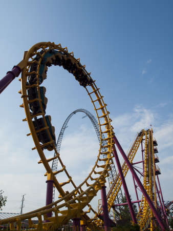 view roller coaster shambala and red dragon in portaventura, park, of attractions in tarragona, catalonia, spain