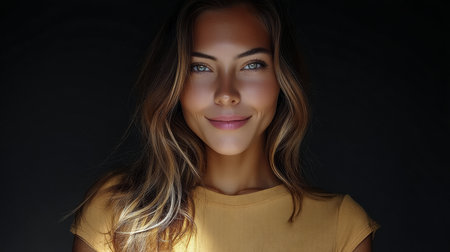 A woman with long, flowing hair smiles gently while wearing a yellow shirt. The soft lighting highlights her bright eyes and warm expression, creating an inviting atmosphere.