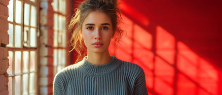 A woman stands confidently indoors, her long hair cascading over her shoulders. Soft natural light illuminates her features, creating a serene atmosphere.