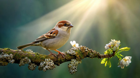 A serene image of a sparrow perched on a branch adorned with delicate flowers. The soft sunlight creates a peaceful atmosphere, highlighting the beauty of nature.