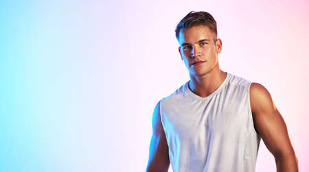 Im always up for a challenge. Studio portrait of a handsome young male athlete posing against a multi-coloured background.