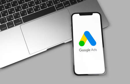 Google Ads AdWords app logo on the screen iPhone, MacBook closeup. Google is the biggest Internet search engine in the world. Moscow, Russia - December 5, 2020