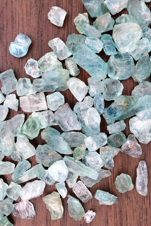A captivating assortment of raw aquamarine crystals showcased on a wooden surface, highlighting their mesmerizing colors and unique structures, ideal for nature enthusiasts.