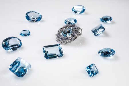 Aquamarine faceted stone mineral macro closeup against a white backdrop