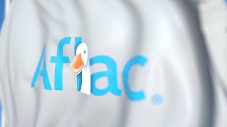 Waving flag with Aflac logo, close-up. Editorial 3D rendering