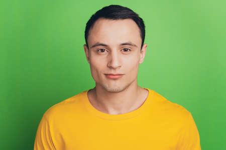 Portrait of charming positive guy look camera on green background