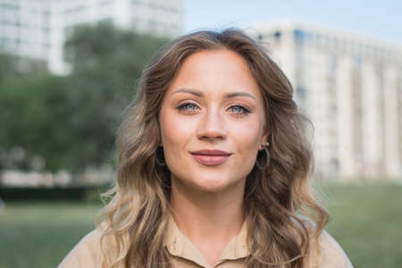 Portrait of a girl of European appearance with long hair on the street. high quality photo