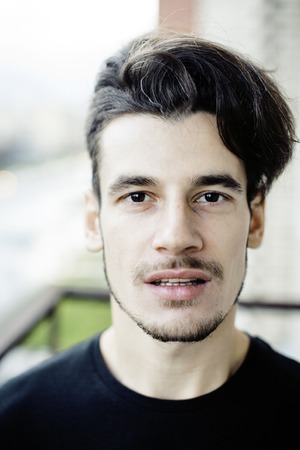 Portrait of handsome young man with dark hair and beard looking at camera