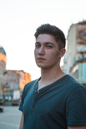 Portrait of a young man in a white T-shirt.