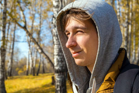 A young white guy or man in casual wear is enjoying the beauty of nature while being out of town, life style.