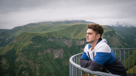 Young man stands at observation deck on background of beautiful green mountains and sky. Handsome guy have a rest before hiking.