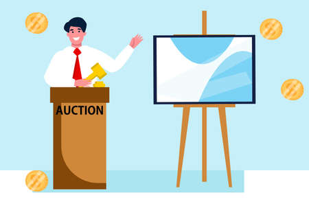 Man Auctioneer with Gavel. Sales in Art Gallery. People Buyers Bargain for Picture. Vector Flat Illustration.