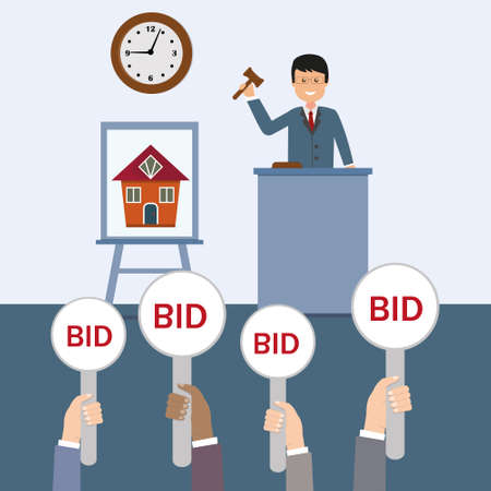 Auction sale buyer competition and legal finance trade. Human competitor hand holding paddle plate with bid text and auctioneer hammer to close deal vector illustration for auction and bidding design