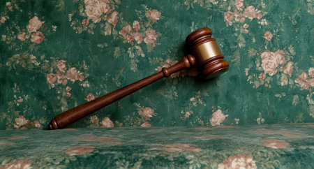 An auctioneer's hand brings a wooden gavel down towards documents marked with a red SOLD stamp. The scene takes place in a crowded auction house with the audience blurred in the background, focusing on the moment of sale. This image represents concepts of bidding, sales, legal proceedings, and final decisions.