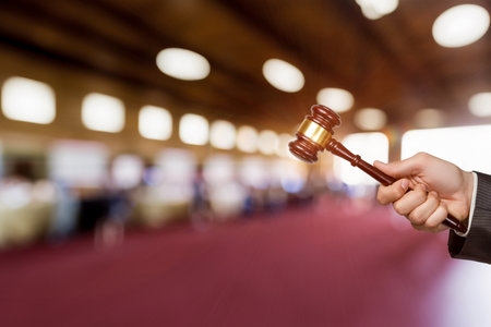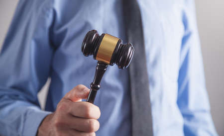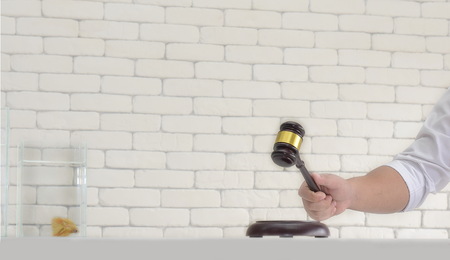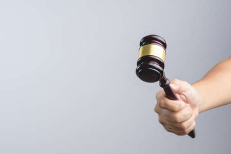 hand of Judge's holding wooden hammer knocking a gavel against wooden background.