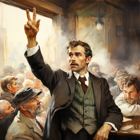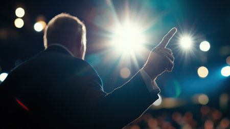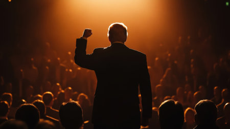 Under dramatic stage lighting a politician stands resolutely with a clenched fist pledging to uphold justice and equality for all. The framing captures their unwavering gaze reflectin
