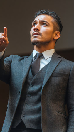 A man dressed in a sharp suit stands with a focused expression, pointing decisively. The low light enhances his serious demeanor, highlighting a sense of urgency and resolve.