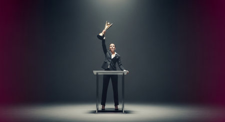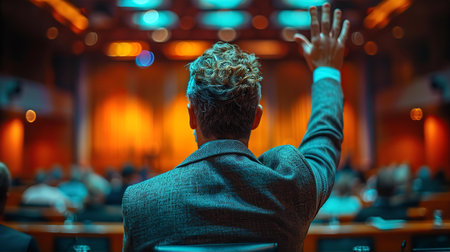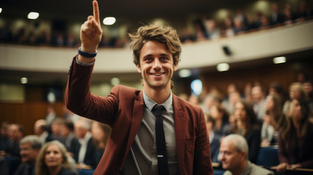 Portrait of a young deputy giving a speech in a conference hall and show finger up. Generative AI.
