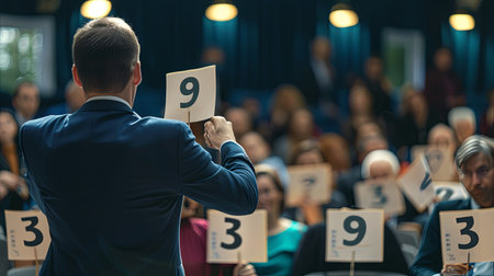 Rear view of man raising his tablet with number up while sitting at auction in art gallery among other people