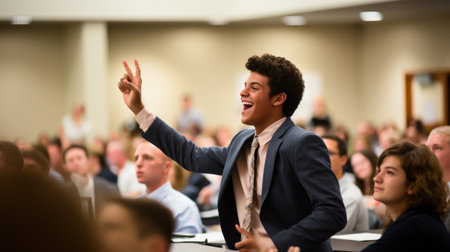 Enthusiastic young man raising his hand and making a peace sign gesture while surrounded by a group of people in what appears to be a formal academic or professional setting.