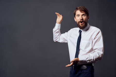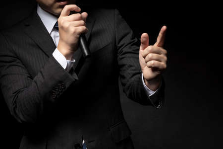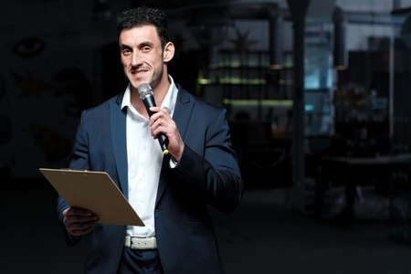 Close up portrait of a man 30-34 years old in a white shirt and a dark blue jacket on a dark background. A man holds a microphone and clipboard with clip in his hands and holds an event.