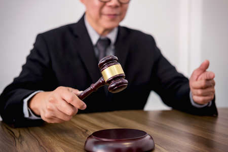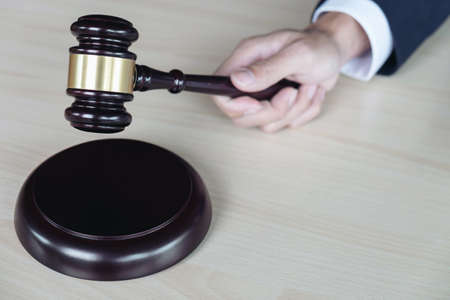 Close up of hand, Judge hitting gavel on wooden table and working in a courtroom striking, Law and justice concept.