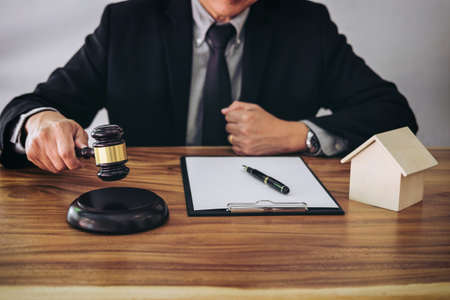 Male lawyer or judge hand's striking the gavel on sounding block, working at courtroom for decide home insurance, Law and justice concept, Settle a house dealing lawsuit.