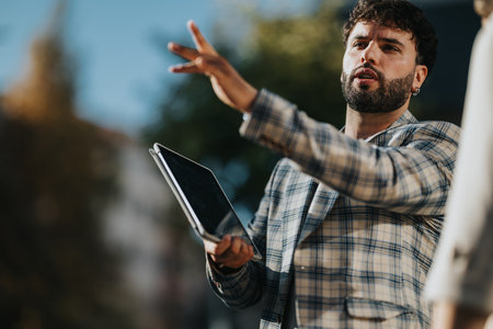 Confident man with tablet gestures outdoors in a plaid blazer during a daytime business discussion