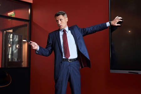 Content charismatic senior businessman in black suit standing at speech table gesturing hand at forum participant while asking his opinion