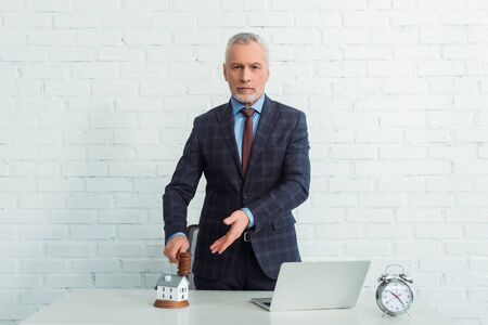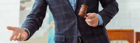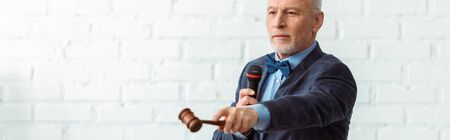 panoramic shot of auctioneer holding wooden gavel and pointing with hand during auction