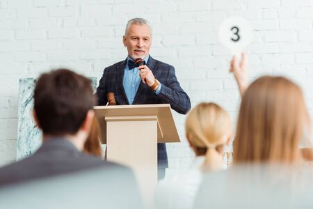 selective focus of auctioneer talking with microphone and looking at buyer during auction