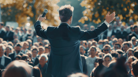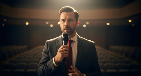 A confident man in a formal suit and tie stands on a stage, speaking passionately into a microphone during a rehearsal. The empty seats of the large auditorium are visible in the background, creating a focused and professional atmosphere for a public speaking event.