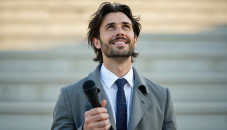 Close-up of a reporter's microphone in the hands of a correspondent in a gray or dark blue suit. AI generative