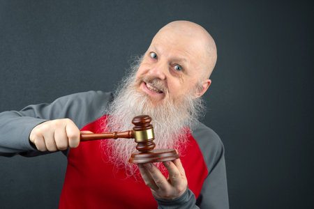 bald and bearded man holds in his hands a wooden gavel for court decisions and law. concept of lawyer and knowledge of law