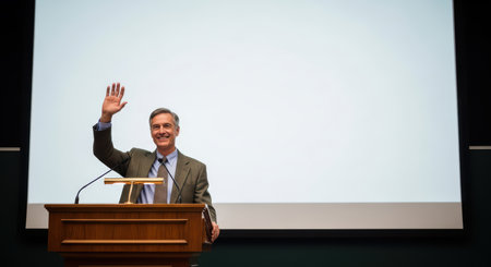Caucasian mature male speaker at podium waving to audience in lecture setting