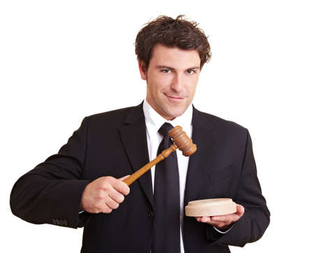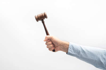 Judges gavel in mens hand on white background. Wooden hammer for auction