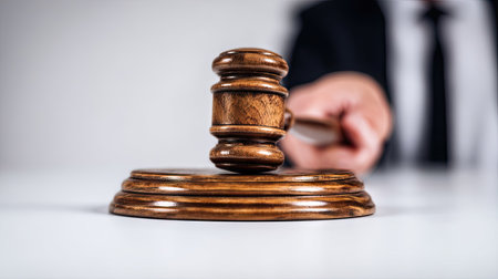 A wooden gavel rests on a circular stand, highlighting concepts of justice and law. The image displays warm tones and the wooden texture. A blurred hand and part of a person's suit and tie are visible in the background against a neutral backdrop, making it suitable for legal or business presentations.