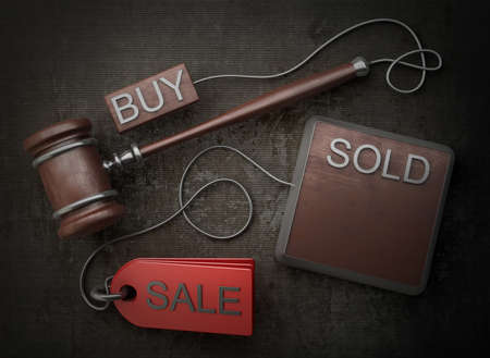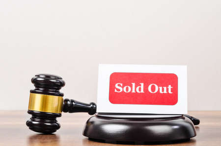 Business auction concept. Wooden gavel and sold out tag in wood room.