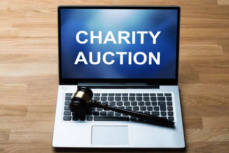 Elevated View Of Charity Auction Word On Digital Tablet Near Judge Gavel And Striking Block