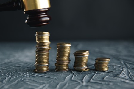 Judge's gavel with dollars in roll and golden coins