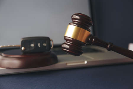 Car key, wooden gavel and alcohol drinks in neon light. Dangerous driving and law