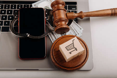 Phone in the handcuffs with card box and wooden gavel on a laptop. Top view