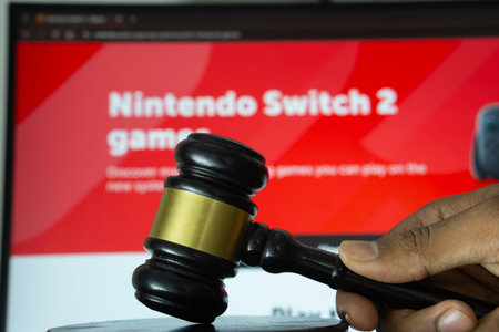Dhaka, Bangladesh- 20 June 2025: A hand holds a gavel in front of a computer screen displaying Nintendo's website