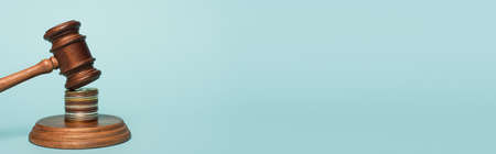 wooden gavel and coins on blue background with copy space, anti-corruption concept, banner